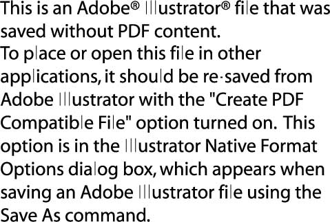 이 파일을 다른 응용 프로그램에 place를 시키거나 열고자 하시는 경우에는, 이 파일을 어도비 일러스트레이터에서 여신 후에 "Create PDF Compatible File(PDF 호환 파일 생성)" 옵션에 체크를 한 상태로 재저장을 하셔야만 합니다.